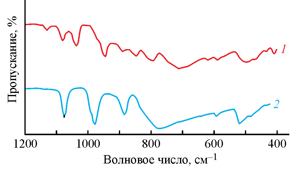 Рис. 1. ИК-Фурье спектры синтезированных Се- (1) и La- (2) содержащих образцов полиоксофосфорвольфрамата (ПОВ).