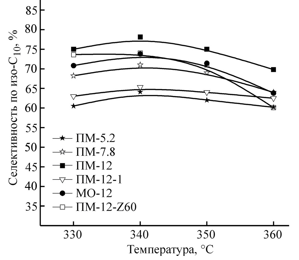 Тестирование каталитических свойств образцов проводили в проточном трубчатом реакторе при следующих условиях: P = 3.5 МПа, T = 320–370°C, массовая скорость подачи сырья = 2.35 ч−1, отношение H2 /сырье = 450 нм3/м3. Непосредственно перед испытанием катализаторы подвергали жидкофазному сульфидированию in situ по методике, описанной в [18]. Модельное сырье для испытаний представляло собой н-декан с добавлением диметилдисульфида (ДМДС), обеспечивающего постоянство химического состава катализаторов, и анилина, стабилизирующего каталитические показатели в условиях испытаний. ДМДС и анилин добавляли в количестве, эквивалентном содержанию серы и азота 500 и 15 ppm соответственно. Расчет конверсии н-декана, селективности в направлении изомеризации и выхода продуктов изо-C10 осуществляли на основании результатов хроматографического анализа газовых и жидких проб на газовом хроматографе Хроматэк-Кристалл 5000. Продолжительность каждого испытания составляла не менее пяти суток. Для проверки стабильности каталитических показателей с течением времени в некоторых испытаниях в конце цикла возвращались к начальным условиям. Показатели в начале и в конце цикла показывали хорошую сходимость при превращении модельного сырья, содержащего ДМДС и анилин.