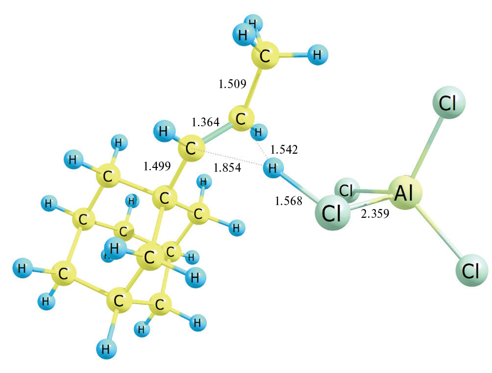 Энергия Гиббса распада Ad–CH2–CH+–CH3•AlCl4– на пропениладамантан и катализатор (реакция 10): Ad–CH2–CH+–CH3•AlCl4– → → Ad–CH=CH–CH3 (транс) + AlCl3•HCl составляет при 0 K ΔE0 = 16.5 ккал/моль, ΔE0≠ = 0.04 ккал/моль, при 298 K ΔG298 = 2.3 ккал/моль. Переходное состояние данной реакции представлено на рис. 7. Учет термических поправок приводит к ситуации, когда энергия Гиббса переходного состояния ниже соответствующего значения реагента, что позволяет считать, что процесс проходит практически без затрат энергии.
