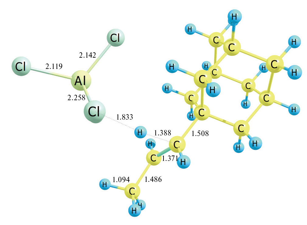 Перейдем к рассмотрению многостадийной реакции получения ионным алкилированием 1-н-транс-пропениладамантана. В результате взаимодействия катиона Ad–CH2–C+H–CH3 с катализатором (реакция 6) образуется интермедиат Ad–CH2–CH+(AlCl4–)–CH3 (рис. 1) с выделением энергии. Изменение нулевой энергии в ходе реакции ΔE0 = −88.2 ккал/моль (B3LYP/6-31G*); −94.9 ккал/моль (B3LYP-D3(BJ)/6-311++G**). Изменение энергии Гиббса в ходе реакции ΔG298 = −70.8 ккал/моль (B3LYP/6-31G*), −77.7 (B3LYP-D3(BJ)/6-311++G**).
