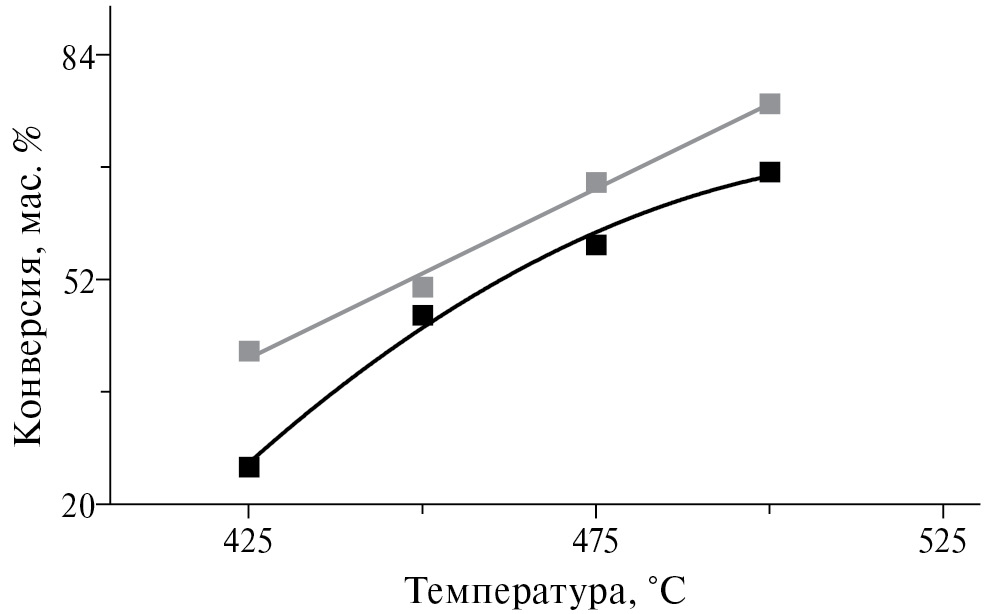 Превращение н-гексадекана в условиях каталитического крекинга. В начале исследования было выполнено изучение превращения н-гексадекана на равновесном цеолитсодержащем катализаторе крекинга в диапазоне температур от 425 до 500°C. На рис. 1 показана зависимость конверсии чистого н-гексадекана и н-гексадекана в модельной смеси н-гексадекан–изопропанол от температуры крекинга. Так, из полученных данных видно, что с ростом температуры проведения эксперимента значения конверсии увеличивались от 25.4 (425°C) до 67.4 мас. % (500°C). При превращении модельной смеси н-гексадекан + изопропанол, как и при превращении н-гексадекана, с ростом температуры крекинга отмечалось повышение конверсии парафина. При этом присутствие алифатического спирта в модельной смеси способствовало росту конверсии н-парафина, особенно при пониженной температуре крекинга (425°C).