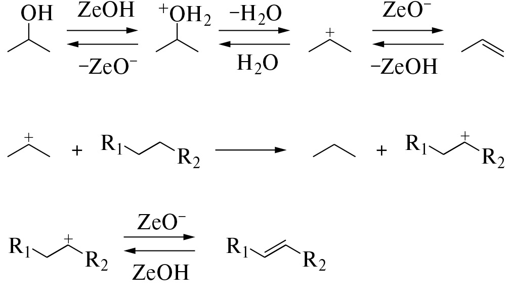 В литературе описаны примеры процессов, позволяющих получать топлива и продукты нефтехимии при превращении спиртов. Так, например, процесс MTO (methanol-to-olefins) позволяет получать низшие олефины из метанола, что имеет особое значение из-за постоянно растущего спроса на олефины [13]. Для производства моторных топлив из алифатических спиртов применяют процесс MTG (methanol-to-gasoline) [14]. Для улучшения технических характеристик дизеля/биодизеля используется прием его смешения со спиртами [15]. Процесс ATJ (alcohol-to-jet) позволяет получать компоненты реактивного топлива в результате последовательного протекания реакций дегидратации спиртов (этанол, изобутанол и н-бутанол), олигомеризации и гидрирования [16]. Также существует процесс MTA (methanol-to-aromatics) для производства ароматических углеводородов – ценного сырья нефтехимической промышленности [17], протекающий по тому же механизму, что и процесс MTG.