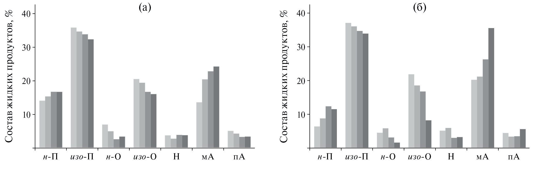 В табл. 4 приведен состав газообразных продуктов при крекинге н-гексадекана. Основную часть газов составляли углеводороды пропан–пропиленовой (ППФ) и бутан–бутиленовой (ББФ) фракций. При этом по мере увеличения температуры в составе ППФ отмечалось повышение содержания пропилена, в составе ББФ –рост содержания изобутана и н-бутена – типичных продуктов крекинга парафинов нормального строения. Суммарное содержание углеводородов С1–С2 не превышало 2.5%.