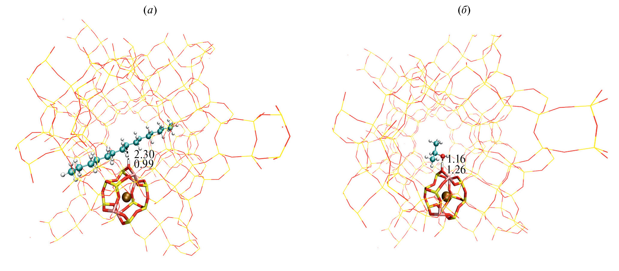 Тепловые поправки проводили на основе частот, полученных с помощью частичного гессиана. Для этого все атомы, кроме двух тетраэдных структур цеолита и протона, которые образуют бренстедовский кислотный центр (БКЦ), и адсорбата, были зафиксированы в своих декартовых координатах. Подобный подход использования частичного гессиана достаточно для определения точных разностей энтальпии и энтропии [39]. Достижение локальных минимумов подтверждается анализом нормальных мод, показывающим, что частичная матрица Гесса включает только положительные собственные моды.