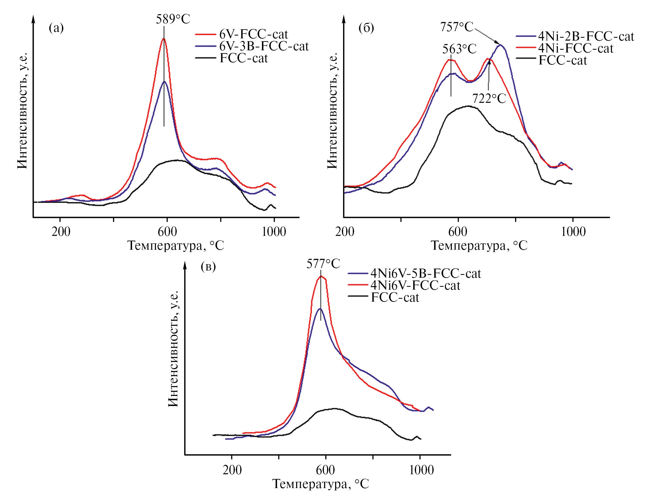 Катализаторы после дезактивации никелем и ванадием и после их пассивации были исследованы методом температурно-программируемым восстановлением водородом (рис. 4). Также для исследуемых образцов было рассчитано количество поглощенного водорода (табл. 3). На ТВП-кривой образца, содержащего 6000 ppm ванадия, можно выделить характерные сигнал при 589°С и плечо при 790°С (рис 4 а). Сигнал при 589°С относится к восстановлению V2O5 → V6O13, плечо при 790°С к восстановлению V6O13 → V2O4 → V2O3. После нанесения борсодержащего пассиватора на образец 6V-FCC-cat наблюдается снижение количества поглощенного водорода на 42 мкмоль. Схожие результаты получали авторы [19, 20] при допировании бором катализатора VOx/Al2O3, уменьшение поглощения водорода происходило за счет образования более стабильной и трудновосстанавливаемой связи B–O–V в сравнении со связью V–O–V. Исходя из количества поглощенного водорода образца после пассивации 6000 ppm ванадия можно заключить о связывании 30–40 мас.% V от исходного количества в неактивной форме в реакциях гидрирования–дегидрирования. При пассивации 4000 ppm никеля снижения (рис. 4 б и табл. 3) количества поглощенного водорода не происходило, наблюдалось уменьшение доли легковосстановимого никеля и сдвиг высокотемпературного сигнала шпинелеподобных структур NixAl2O3+x и силиката никеля. На ТПВ-кривой дезактивированного 4000 ppm никеля и 6000 ppm ванадия образца детектировался уширенный пик в температурной области 400–900°С, который, вероятно, представляет собой суперпозицию сигналов образцов 6V-FCC-cat и 4Ni-FCC-cat (рис. 4 в). После нанесения борсодержащего пассиватора в количестве 5000 ppm на катализатор 4Ni6V-FCC-cat количество поглощенного водорода уменьшалось на 44 мкмоль. Аналогичное снижение в поглощении водорода было зафиксировано после пассивации образца 6V-FCC-cat.