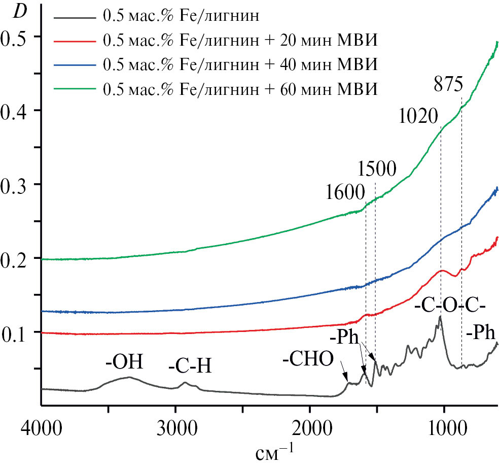 Спектры твердых остатков после деструкции лигнина под влиянием МВИ через 20, 40 и 60 мин воздействия значительно отличаются от спектра исходного лигнина с железом (рис. 3). В спектре через 20 мин обработки МВИ исчезают все полосы валентных колебаний связей О–Н и С–Н. Максимумы полос от связей С–О (1000–1300 см–1) меняют относительную интенсивность. В спектре остаются полосы, характеризующие ароматическое кольцо. В образце с временем обработки МВИ 40 мин еще больше уменьшается интенсивность полос от связей С–О–С. Подобная динамика наблюдается и для образца со временем обработки 60 мин: остаются широкие полосы при 1500 и 1600 см–1 от валентных колебаний ароматического кольца, при 875 см–1 – от деформационных колебаний, а при 1020 см-1 остаются связи С-О-С. При этом, вероятнее всего, атом углерод в этих связях, находится при ароматическом кольце, т.к. в спектре отсутствуют признаки валентных и деформационных колебаний связей СН2 и СН3. Кроме того, рост общего фона поглощения в длинноволновой области спектра (к 600 см–1) указывает на высокое содержание окисленных форм в данном материале и на присутствие оксидов металлов. Такие изменения в спектре свидетельствуют о существенном преобразовании структуры лигнина в результате деструкции, основными структурными элементами твердого продукта разложения лигнина остаются замещенные ароматические кольца.