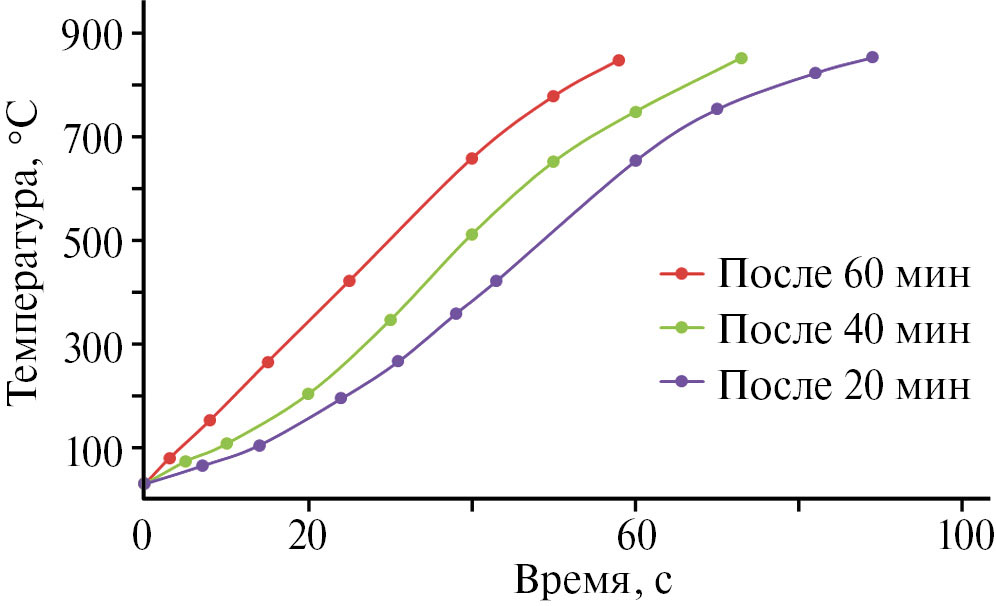 Рис. 5. Температурные профили нагрева биоугля под различным временем воздействия