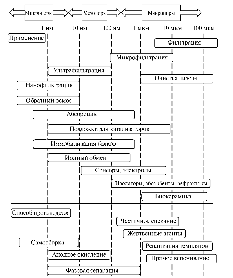 Рис. 2. Классификация пористых керамических материалов по размерам пор, областям применения и способам производства.