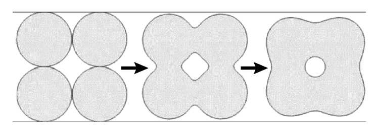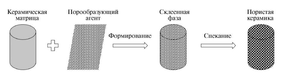 Рис. 3. Схематическое изображение процесса образования пористого керамического материала с применением порообразующего агента.