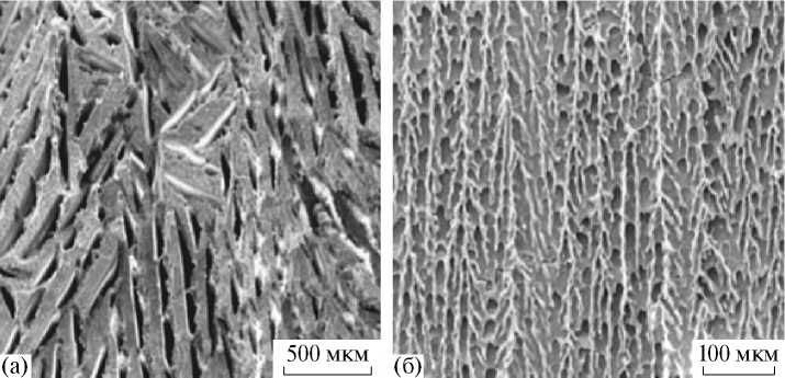 Важно отметить, что температуры заморозки и спекания оказывают непосредственное влияние на формирование структуры образующихся пор и их распределение по размерам. По сравнению с замораживанием растворов данный метод дает лучшие результаты, выражающиеся в малой усадке компакта, хорошей механической прочности готового продукта, широком диапазоне возможностей регулирования его пористости на стадии приготовления. Кроме того, данный подход весьма экологичен. Структура ПКМ, изготовленных методом лиофильной сушки, показана на рис. 4.