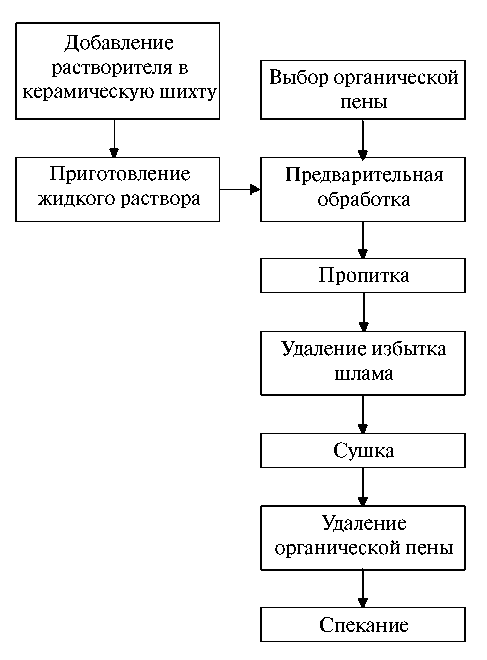 - Пропитка полимерной ячеистой матрицы приготовленной керамической суспензией с ее последующим прессованием, сушкой и термической обработкой.