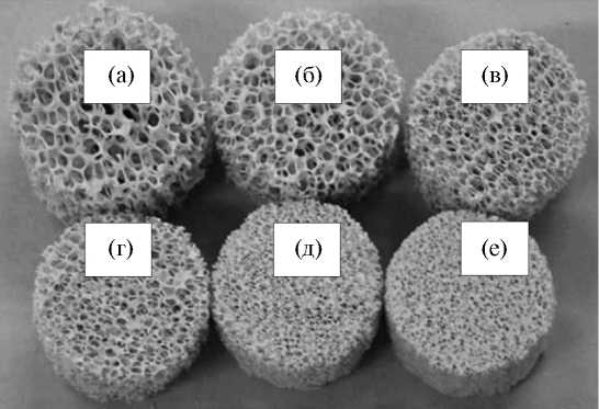 Рис. 6. Морфология пористого кремниевого керамического материала с различным диаметром пор и пористостью: (а) 5.7 мм / 78 об.%; (б) 5.3 мм / 77.8 об.%; (в) 4.4 мм / 77.3 об.%; (г) 3.2 мм / 76.2 об.%; (д) 2.4 мм / 74.9 об.%; (е) 2.2 мм / 74.6 об.%.