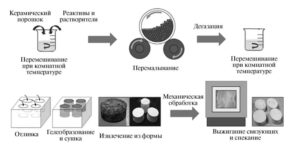 В качестве порообразующих агентов в керамические суспензии можно добавлять углеродные порошки или летучие органические вещества, которые в процессе спекания компакта либо выгорают, либо испаряются. Примером такого порообразующего агента является крахмал. На начальном этапе синтеза ПКМ крахмал замешивают с водной керамической суспензией. Далее полученным раствором заполняют форму, которую нагревают до температуры 50–70°C [24]. В этих условиях крахмал с поглощением воды набухает, а керамическая суспензия затвердевает. В результате получается конечный продукт, пористость и размер пор которого зависят от количества и размера частиц порошка крахмала. Данный метод имеет ряд преимуществ по сравнению с традиционными, а именно простоту исполнения, низкую стоимость и возможность эффективного контроля пористости материала на этапе его приготовления. Вместо крахмала в качестве порообразующего агента также можно рассматривать порошки, приготовленные из риса либо картофеля, или же их комбинацию.