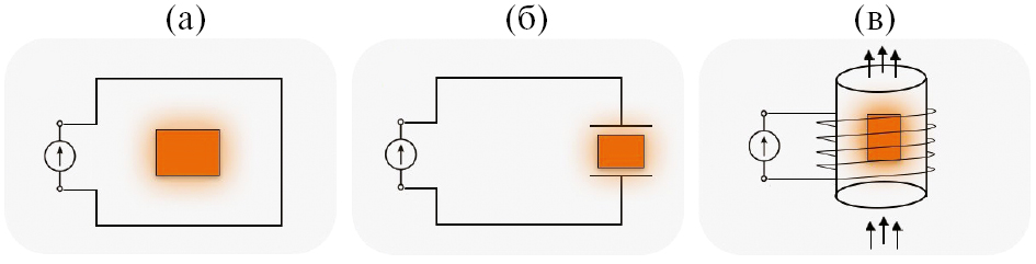 Индукционный нагрев (ИН) проводят за счет помещения образца в т. н. индуктор, представляющий собой, как правило, один или несколько витков медного провода (рис. 1в). Вокруг индуктора создается электромагнитное поле [19], приводящее к появлению вихревых токов, нагревающих образец.