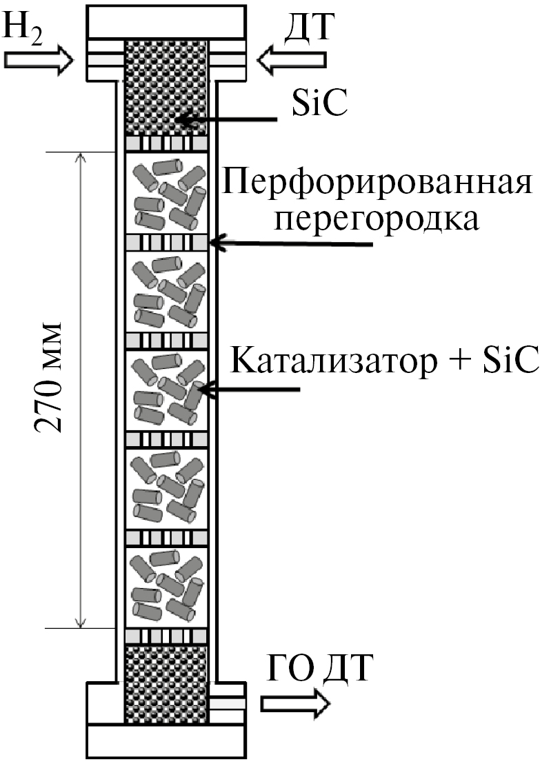 Эксперименты проводили в реакторе проточного типа длиной 110 см и внутренним диаметром 24 мм (рис. 1) [18]. В реактор загружали катализатор (30 см3), смешанный с фракцией карбида кремния SiC (размер зерен — 0.15–0.3 мм) в объемном соотношении SiC : катализатор = 4 : 1. Аналогичный подход широко используют при проведении лабораторных испытаний катализаторов гидроочистки для улучшения смачивания гранул катализатора и уменьшения проскоков сырья [19]. После экспериментов гранулы катализатора отделяли от порошка SiC, используя сито с ячейкой 1.0 мм. В условиях реакции гидроочистки дизельного топлива карбид кремния является химическим инертным материалом, не приводящим к увеличению содержания кремния в составе катализатора. Данный факт подтверждается результатами холостого эксперимента, в котором в качестве сырья использовали дизельное топливо, не содержащее добавки декаметилциклопентасилоксана. Содержание кремния в катализаторе после холостого эксперимента составляло <0.1 мас.%, аналогично свежему катализатору.