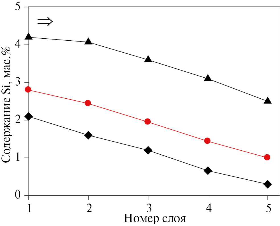 Рис. 2. Изменение содержания кремния по высоте реактора в зависимости от среднего содержания кремния в различных слоях катализатора. Нумерация слоев соответствует направлению движения сырья.