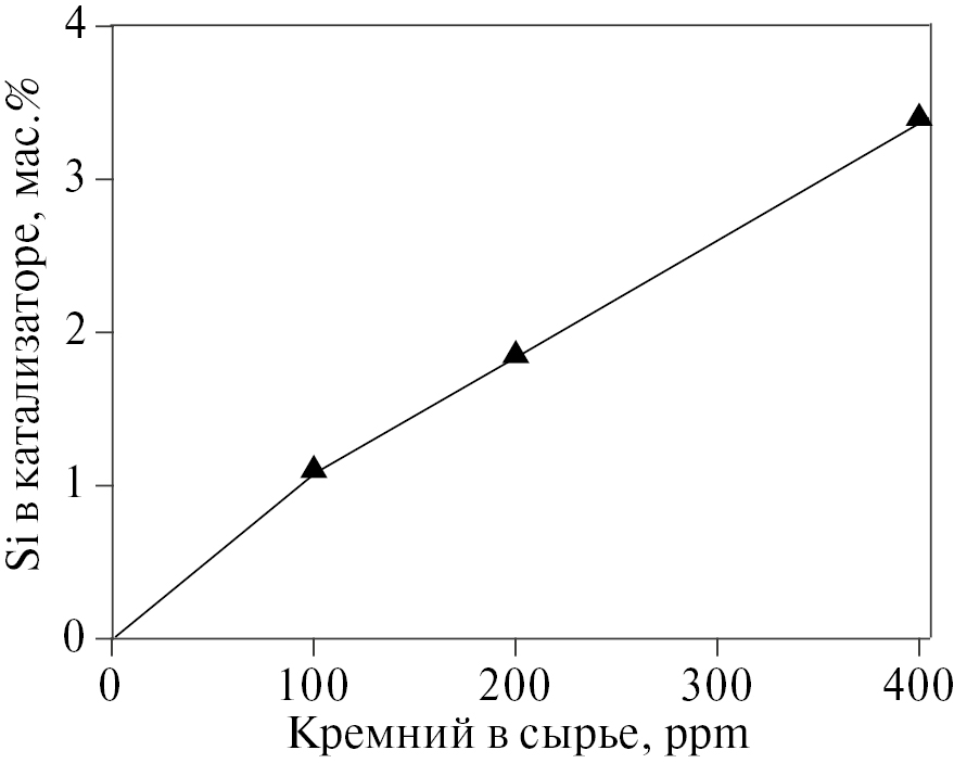 Экспериментами длительностью по 60 ч при различном начальном содержании кремния (Si) — 100, 200 и 400 ppm установлено, что количество сорбированного (поглощенного) катализатором Si за время эксперимента линейно зависит от его содержания в сырье — среднее его содержание в катализаторе составило 1.1, 1.8 и 3.4 мас.%. Показано, что, несмотря на высокую концентрацию кремния (почти на два порядка по сравнению с промышленным сырьем), при его начальной концентрации 100 ppm катализатор эффективно и практически полностью поглощал кремний. Коэффициент извлечения кремния KSi во всем диапазоне изменения его концентрации менялся от ~1.0 до 0.7.