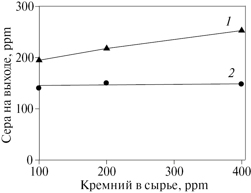 Рис. 4. Изменение содержания серы на выходе из реактора в начале эксперимента (2) и через 60 ч (1) эксперимента в зависимости от содержания кремния в сырье.