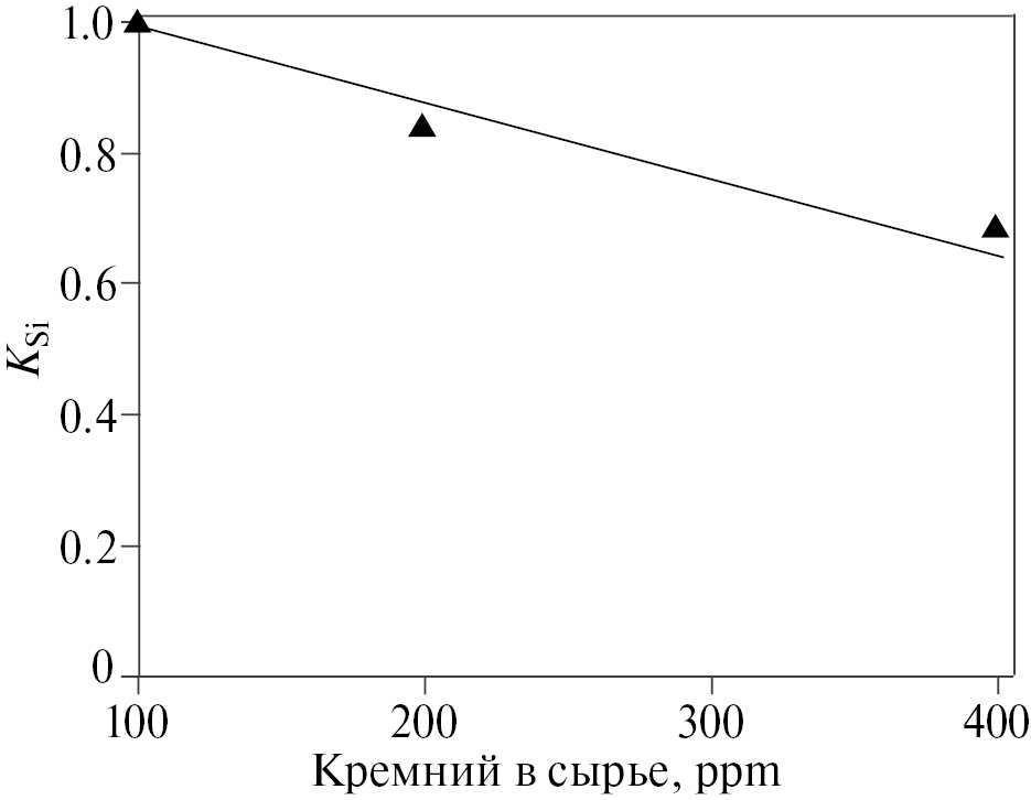 Рис. 6. Коэффициент извлечения кремния (KSi) в зависимости от его содержания в сырье. Время эксперимента 60 ч.