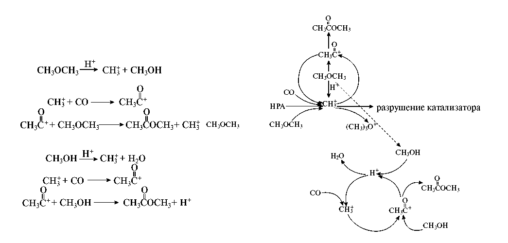 Для гетерогенной реакции карбонилирования ДМЭ [7, 12–15, 31–37] был предложен механизм Коха [25] (рис. 2), который предполагает захват алкилкарбенийиона, образующего из ДМЭ монооксидом углерода с образованием ацилийкатиона. Далее ацилийкатион взаимодействует со второй молекулой простого эфира (или воды) с образованием сложного эфира (или уксусной кислоты) [26, 38]. Кроме этого, карбений- и ацилийкатионы могут существовать на твердокислотном катализаторе в связанном состоянии в виде поверхностных алкокси- и ацетатных групп соответственно. Механизм карбонилирования ДМЭ на твердой ГПК, H3PW12O40, был доказан методом твердотельного ЯМР [16].