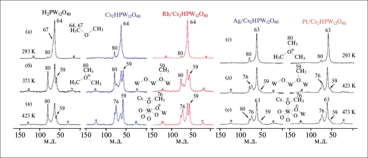 Следует отметить изменение интенсивностей сдвигов в спектрах образцов H3PW12O40, Cs2HPW12O40 и Rh/Cs2HPW12O40 при увеличении температуры обработки катализаторов ДМЭ (до 423 К — температуры реакции карбонилирования). В данном случае увеличивается интенсивность сдвига от поверхностной метоксигруппы, а интенсивность сдвига катиона триметилоксония снижается (рис. 3б, в). Обращает на себя внимание увеличение интенсивности сигнала при 76 м. д., наблюдаемого в спектрах цезиевых солей ГПК, немодифицированной и модифицированной родием (рис. 3в). В спектре образца H3PW12O40 такой сдвиг отсутствует (рис. 3в) [37]. Очевидно, что появление данного сдвига происходит за счет наличия катионов цезия [41]: в данном случае метоксигруппа включает терминальный кислород структуры Кеггина, образующий связь с катионом цезия. В спектрах образцов Ag/Cs2HPW12O40 и Pt/Cs2HPW12O40 сдвиг при 76 м. д. также присутствует, однако его интенсивность ниже (рис. 3д, е).