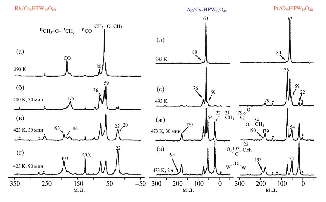 На образцах Ag/Cs2HPW12O40 и Pt/Cs2HPW12O40 реакция не протекает до 423 К, небольшая конверсия имеет место быть на платиновом катализаторе (рис. 5е). Реакция начинает протекать при 423 К, и метилацетат является единственным продуктом, идентифицируемым типичными сдвигами при 22 (CH3), 54 (CH3-O) и 179 м. д. (C=O) [39, 62]. Сдвиги низкой интенсивности при 193 и 22 м. д. указывают на образование ацетата, связанного с поверхностью катализатора (ацетат Кеггина) [65]. Ацетат образуется за счет внедрения CO в связь O–CH3 поверхностной метоксидной группы. Для образца Rh/Cs2HPW12O40 наблюдается непосредственное превращение карбонил-родия во фрагмент > C=O ацетата, поэтому свободный CO в газовой фазе отсутствует. На Ag- и Pt-содержащем катализаторе комплексы карбонил-металл находятся в равновесии с газообразным монооксидом углерода. Таким образом, ацетат Кеггина может образоваться либо из фрагмента карбонил– металл или непосредственно из газообразного CO, что характерно для Ag/Cs2HPW12O40 и Pt/Cs2HPW12O40 (рис. 5ж, з).