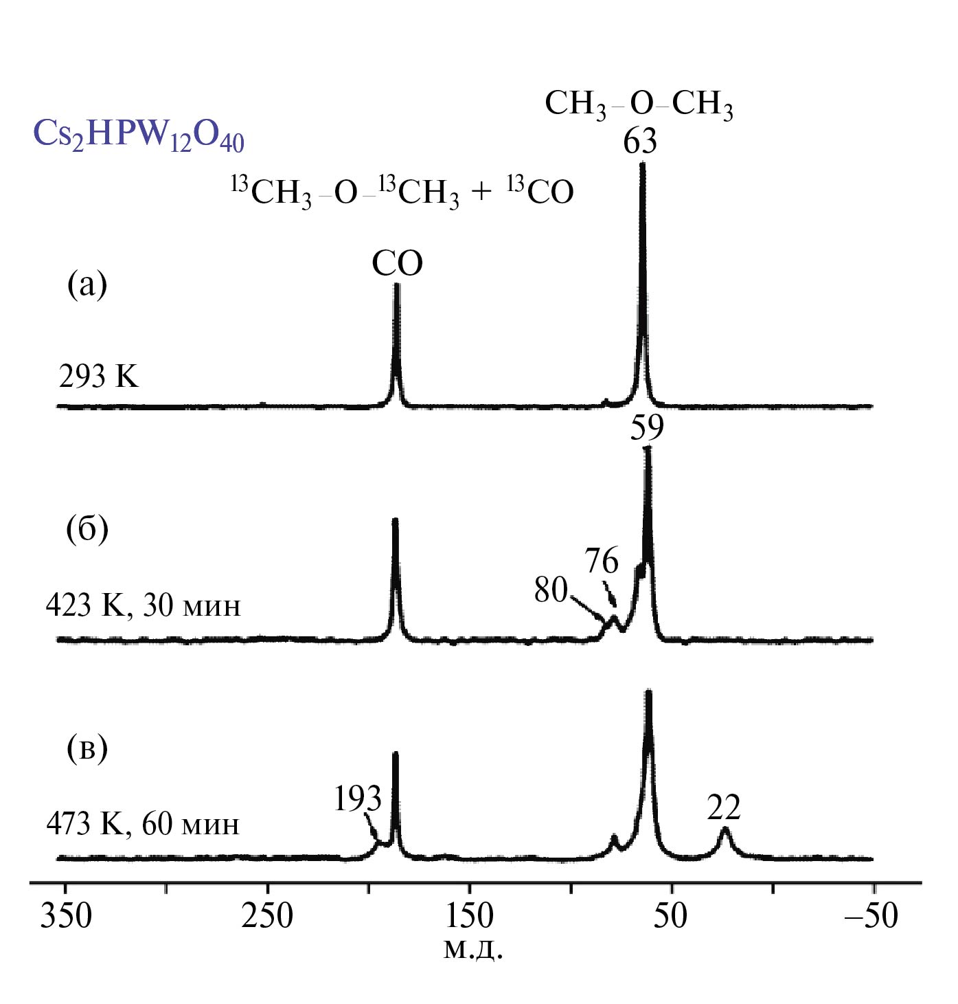 Для образца Rh/Cs2HPW12O40 при температурах менее 400 К CO и ДМЭ превращаются в Rh-карбонилы и метоксигруппы соответственно (рис. 5а). При комнатной температуре сдвиг при 64 м. д. соответствует непрореагировавшему ДМЭ, при 174 м. д. — родиевому карбонилу; кроме этого, образуется небольшое количество иона триметилоксония. Нагрев образца до 423 К в течение 30 мин приводит к практически полному поглощению ДМЭ и уменьшению интенсивности сдвига от Rh-карбонилов (рис. 5в). Вместо ДМЭ наиболее интенсивный сдвиг при 59 м. д. от поверхностной метоксигруппы представлен в алифатической области спектра, а также сдвиг от метоксида и катиона цезия, связанного с атомом кислорода (76 м. д., рис. 5в). Сдвиги при 22 и 193 м. д. соответствуют продуктам карбонилирования — метильной и карбоксильной от ацетата группам соответственно. Кроме этого, образуется незначительное количество уксусной кислоты (186 м. д. (–COOH) и 20 м. д. (CH3-групп) [16, 63]) из ацетата и воды [38].