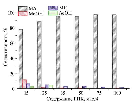 С увеличением содержания цезия в образцах селективности по метилацетату для образцов снижаются. Льюисовские кислотные центры инициируют крекинг молекулы ДМЭ, что приводит к образованию побочных продуктов. Образцы с самым высоким и самым низким содержанием цезия относительно неактивны в реакции карбонилирования ДМЭ. Это может быть связано с двумя факторами: площадью поверхности и бренстедовской кислотностью. Катализатор Rh/Cs1H2PW12O40 имеет относительно низкую площадь поверхности, Rh/Cs2.5H0.5PW12O40 обладает более низкой плотностью бренстедовских кислотных центров. Таким образом, катализаторы Rh/CsxH3-xPW12O40 (1.5 < x < 2) наиболее эффективны в реакции безгалогенового карбонилирования ДМЭ в метилацетат по сравнению с другими твердыми суперкислотами благодаря высокой плотности сильных бренстедовских кислотных центров [10, 17].