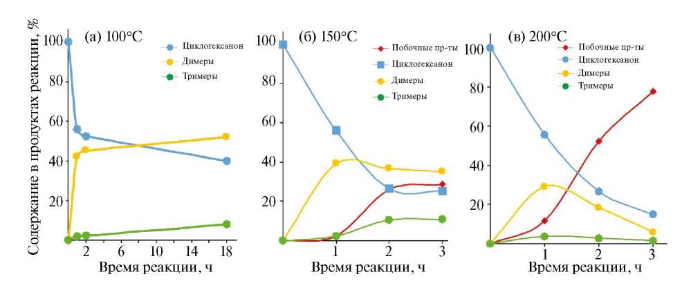 С одной стороны, результаты реакции при 100°C схожи с описанными в работе [23] результатами для Amberlyst-15 и (конверсия циклогексана — 33%), с другой — в работе [38] показано, что в диапазоне температур 110–130°C скорость реакции увеличивается с ростом температуры. В связи с этим было решено изучить воздействие времени реакции на состав образующихся продуктов при 100, 150 и 200°C (рис. 3).