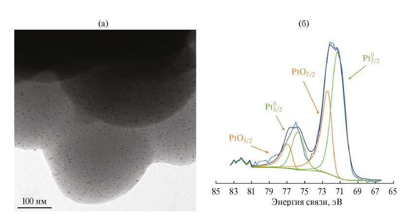 Свойства синтезированного катализатора изучали при помощи элементного анализа, просвечивающей электронной микроскопии и рентгено-фотоэлектронной спектроскопии. Согласно полученным результатам, катализатор содержит 1.05 мас. % платины, что близко к номинальному содержанию металла в материале. На микрофотографии PAF-30-SO3H(5%)-Pt(1%) (рис. 4а) видно, что наночастицы металла равномерно распределены по объему носителя и узким распределением по размеру (4.1 ± 0.4 нм). Как видно из РФЭ-спектра (рис. 4б), большая часть платины (63%) находится в восстановленной форме Pt0 (Eсв 4f7/2 = 71.2 эВ, Eсв 4f5/2 = 75.6 эВ), и около 37% — в форме оксида PtO (Eсв 4f7/2 = 72.6 эВ, Eсв 4f5/2 = 77.0 эВ). Кроме того, в спектре высокого разрешения линии S2p присутствуют два накладывающихся друг на друга пика, соответствующие 2p3/2 и 2p1/2 сигналам для серы в высшей степени окисления S6+. Энергии связи для данных сигналов составляют 168.3 и 169.5 эВ, что соответствует –SO3H-группам.