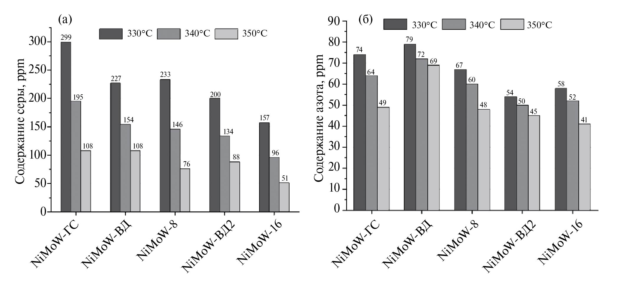 Рис. 1. Остаточное содержание серы (а) и азота (б) в продуктах гидроочистки после реакции при 330, 340 и 350°C для массивных катализаторов, сульфидированных в различных условиях.