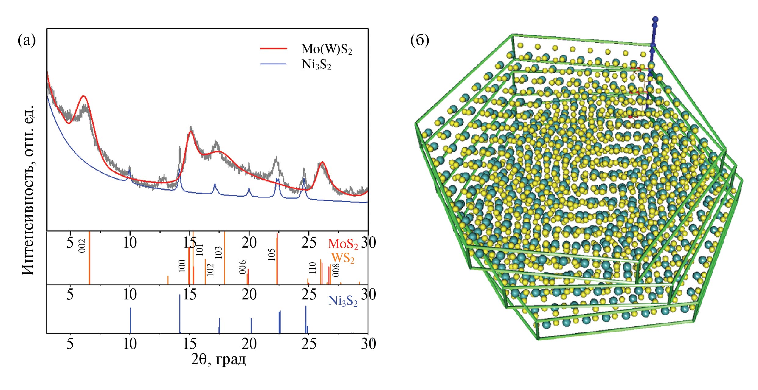 Рис. 2. Порошковая дифракционная картина образца NiMoW-8 в сравнении с рассчитанными профилями для высокодисперсных частиц MoS2/WS2 и частиц Ni3S2 (а) и графическое изображение модельных трехпакетных кристаллитов MoS2/WS2 гексагональной формы с разворотом пакетов (б).