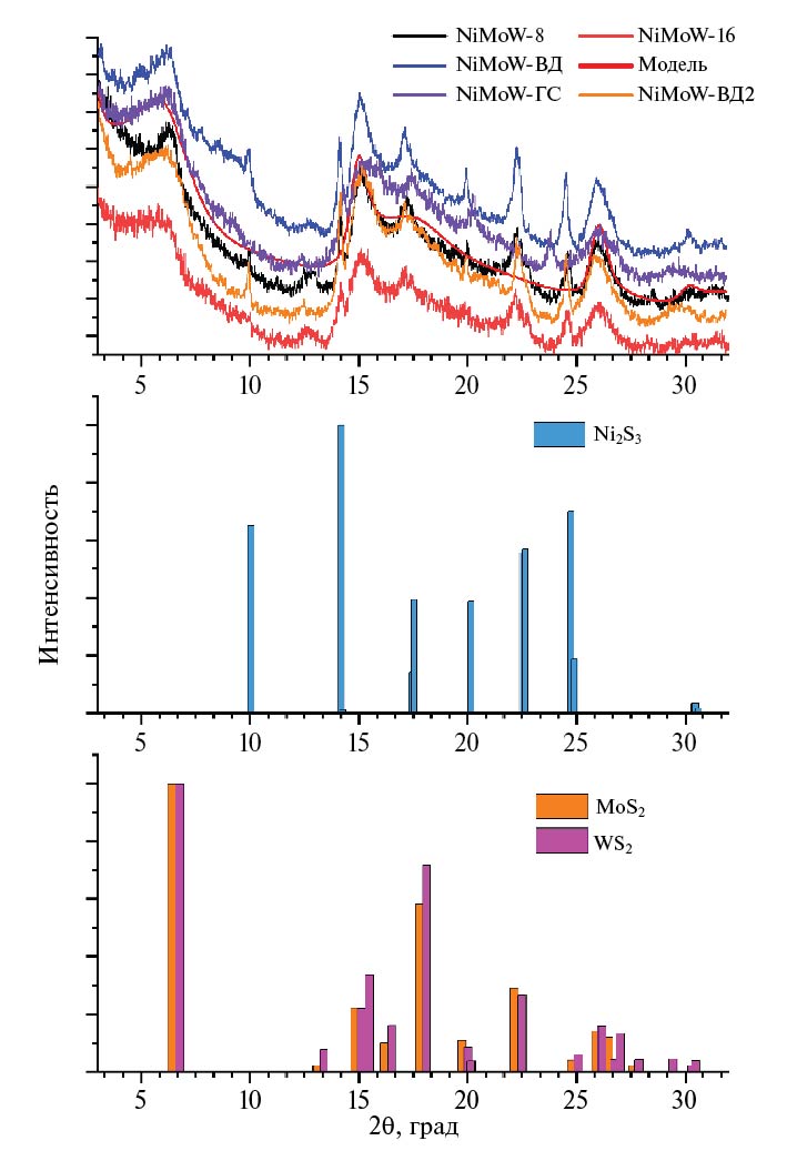 Для образца NiMoW-16 также наблюдаются рефлексы, относящиеся к фазе Ni3S2 (PDF#00-044-1418 a = b = 5.745 Å, c = 7.135 Å). Однако средний размер ОКР существенно снижается — D = 13.5 нм. На дифракционной картине также есть сильно уширенные пики в области углов 4°–7.5°, 13°–22.5° и 24°–27° по 2θ, указывающие на присутствие высокодисперсных, плохо окристаллизованных фаз сульфида молибдена MoS2 или сульфида вольфрама WS2 (рис. 3). Точно определить состав фазы сульфида не представляется возможным. Моделирование рентгенограммы методом Дебая показало наилучшее соответствие модели двухпакетных (n = 2) кристаллитов Mo(W)S2 гексагональной формы с максимальной длиной вдоль пластины Lmax = 3.5 нм и длиной пластины в кристаллографическом направлении {110} D = 3.1 нм. Таким образом, размер частиц уменьшается при увеличении времени сульфидирования. В модельной частице также есть турбостратное разупорядочение с поворотом слоев на 6° относительно друг друга.