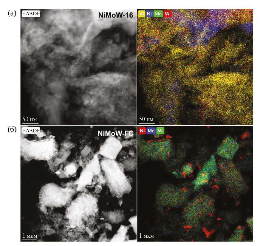 На рис. 4 приведены для примера микрофотографии образцов NiMoW-16 и NiMoW-ГС. Согласно данным ПЭМ ВР, молибден и вольфрам достаточно равномерно располагаются в объеме образца. Катализаторы, полученные жидкофазным сульфидированием, довольно близки между собой — во всех образцах наблюдается сегрегация никеля в виде сульфидов, причем образующиеся частицы довольно большого размера. При переходе к газофазному сульфидированию не отмечено значимых изменений размера сегрегированных частиц сульфида никеля.