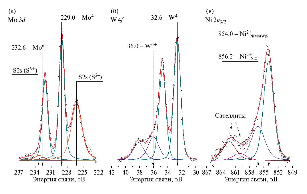 Стоит отметить, что для предотвращения возможного окисления образцов на воздухе в процессе транспортировки из реактора в РФЭ-спектрометр, образцы хранили в гексане, а после нанесения на держатель откачивались до сверхвысоковакуумных (СВВ) условий. На рис. 5 в качестве примера приведены РФЭ-спектры для образца NiMoW-ВД2 (РФЭ-спектры остальных образцов раскладывались на индивидуальные компоненты аналогичным образом и не приведены на рисунке). В приведенных спектрах Mo3d (рис. 5а) пики с энергиями связи ~226.2 и ~233.2 эВ относятся к сере (регион S2s) и характерны для серы в составе сульфидов (S2–) и сульфатов (S6+) соответственно. В РФЭ-спектре Mo3d для образца NiMoW-ВД2 присутствуют два дублета с энергиями связи Mo3d5/2 ~229.0 и 232.6 эВ, что характерно для молибдена в состоянии Mo4+ и Mo6+ [15–17]. Кроме того, в образце NiMoW-8 присутствовал низкоинтенсивный аналогичный дублет с энергией связи Mo3d5/2 ~230.7 эВ, что характерно для молибдена в состоянии Mo5+ [15–17] (табл. 3). В РФЭ-спектре Ni2p3/2 (рис. 5б) присутствуют два пика с энергиями связи ~854.0 и 856.2 эВ. Пик с энергией связи Ni2p3/2 ~854.0 эВ характерен для никеля Ni2+ в составе фазы NiMoS [15, 16] и/или триметаллической NiMoWS-фазы [15, 16], в то время как пик с энергией связи 856.2 эВ характерен для Ni2+ в составе NiO. Два пика, смещенных в область больших значений энергии связи на ~6 эВ, являются сателлитами, характерными для Ni2+. РФЭ-спектры W4f (рис. 5в) раскладываются двумя дублетами с энергиями связи W4f7/2 ~32.6 и 36.0 эВ, которые характерны для вольфрама W4+ и W6+ соответственно [15, 16, 18]. Согласно полученным результатам РФЭС (табл. 3), катализаторы, полученные при жидкофазном длительном сульфидировании (NiMoW-16) и при газофазном сульфидировании, содержат 100% молибдена в наиболее активном состоянии Mo4+. При уменьшении времени сульфидирования, увеличении давления или уменьшении количества стадий сульфидирования происходит снижение доли Mo4+ до 90–96%. Кроме того, катализатор с большим временем сульфидирования и катализатор, сульфидированный газофазно, характеризуются большей долей никеля в сульфидном состоянии в составе промотированной активной фазы (NiMo(W)S). Также отмечено снижение доли вольфрама в активном состоянии W4+ при уменьшении времени сульфидирования. Как было упомянуто выше в силу того, что образцы транспортировались в гексане, что препятствовало воздействию кислорода воздуха на образцы, наиболее вероятно, содержание оксидов металлов, наблюдающихся в РФЭ-спектрах связано именно с эффективностью сульфидирования образцов, а не с их последующим окислением. Таким образом, наиболее активный катализатор, сульфидированный жидкофазно, содержит большее количество металлов в наиболее активном состоянии, что, по-видимому, является определяющим для активности в ГДС- и ГДА-реакциях. Отдельно необходимо отметить, что образцы, обладающие меньшей активностью, характеризуются меньшей поверхностной концентрацией активных металлов, то есть более высокой дисперсностью. При этом условия газофазного сульфидирования также хорошо подобраны, так как обеспечивают высокий уровень сульфидирования металлов и промотирования активной фазы, наравне с образцом NiMoW-16.