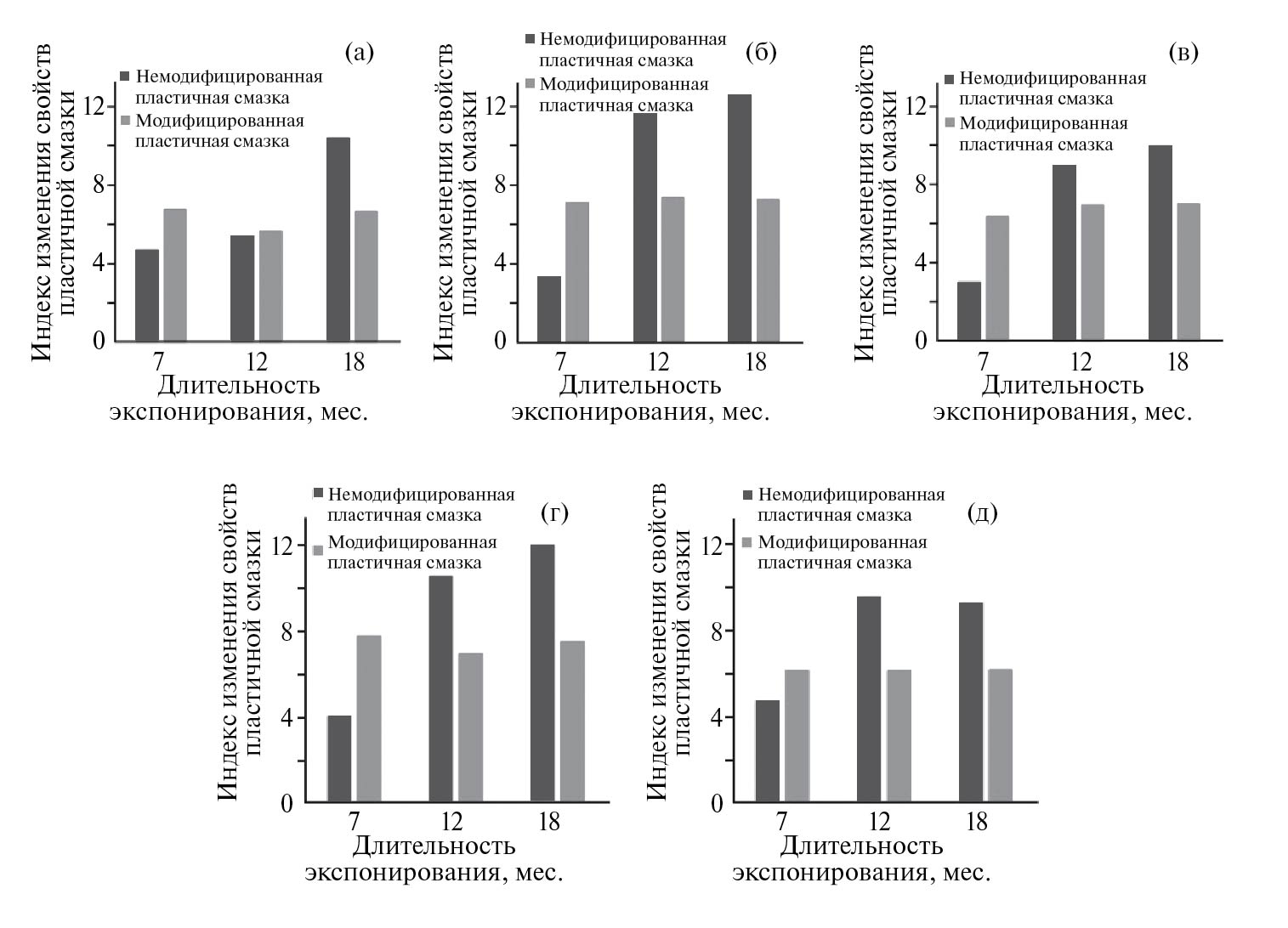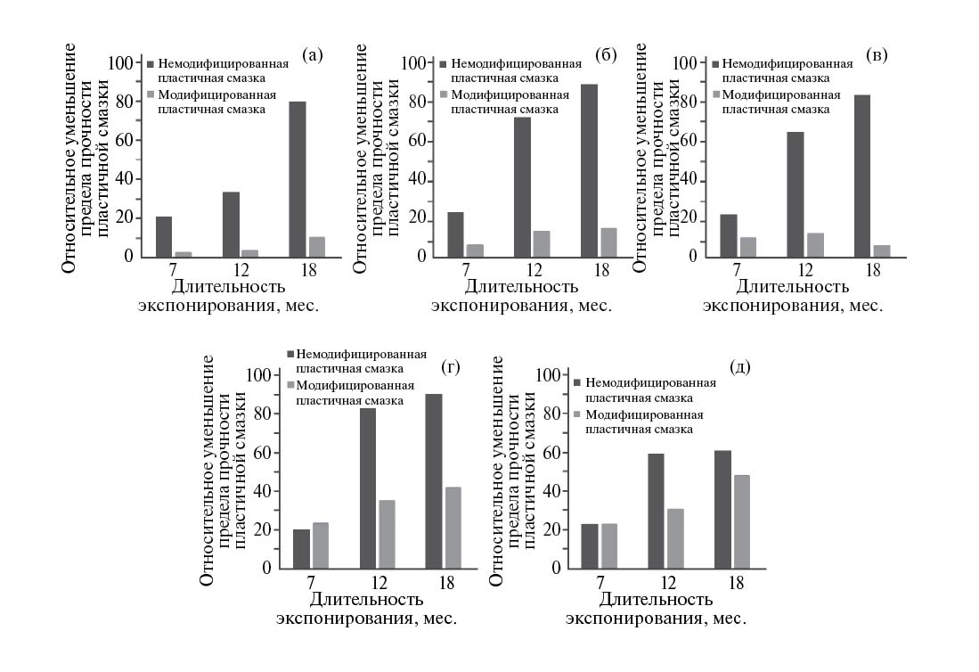 Введение в состав пластичной смазки структурного наполнителя способствует увеличению стабильности смазочного материала. Несмотря на то, что после первых семи месяцев натурных испытаний индекс изменения свойств для модифицированной смазки был больше, чем у немодифицированной на всех площадках, дальнейшее экспонирование не приводит к каким-либо существенным изменениям свойств смазки (значение индекса находится на уровне 6–7). Введение структурного модификатора не позволяет полностью избежать деградации уреатной смазки в начале экспонирования, но при длительном воздействии неблагоприятных условий тропического климата позволяет сохранять физико-химические свойства на уровне, обеспечивающем работоспособность пластичной смазки.