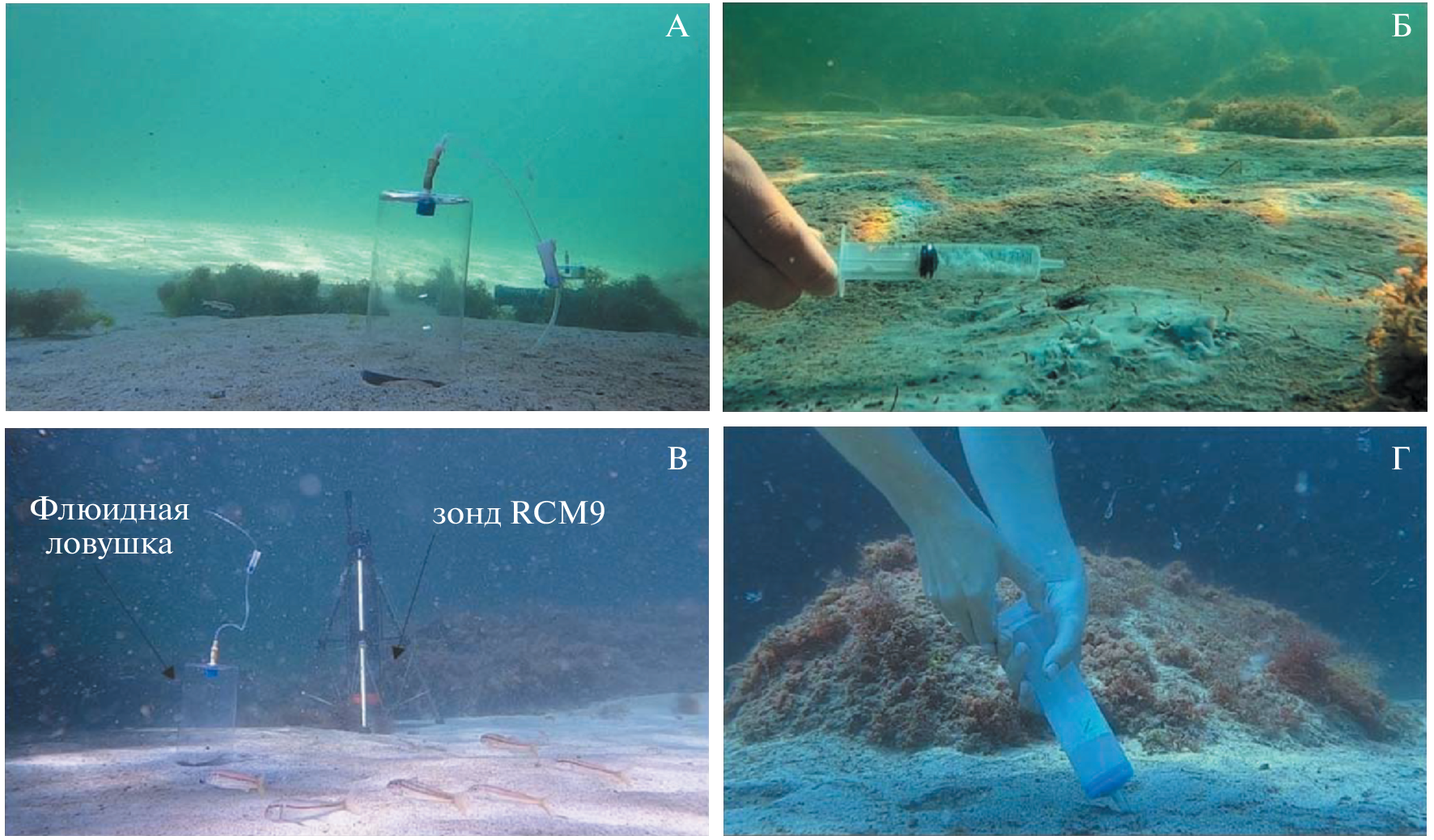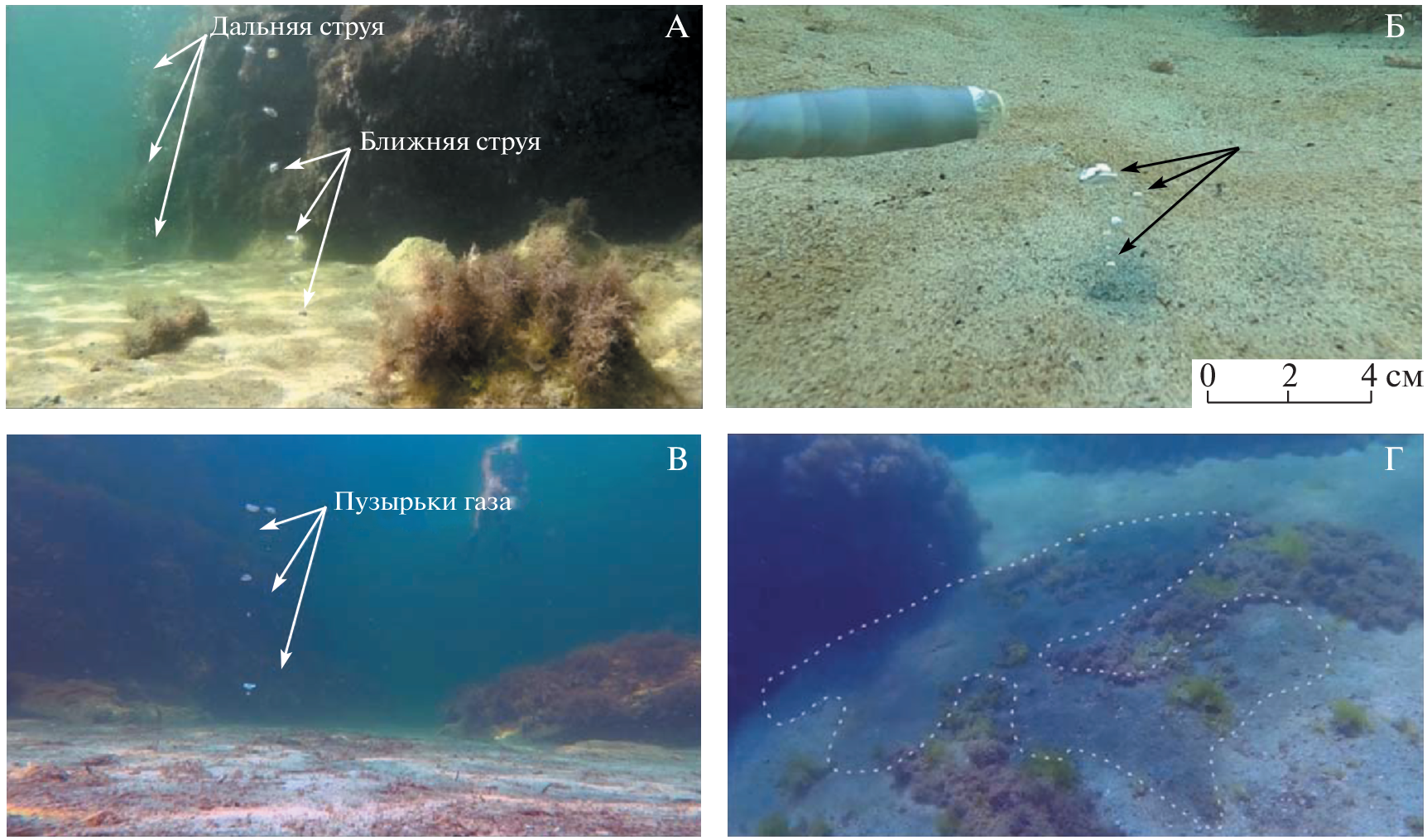 During the period from 2019 to 2021, complex studies of new shallow-water methane bubble gas emission sites were carried out in the coastal zone near Cape Fiolent (Southwest Coast of Crimea). The studies included determining the hydrocarbon and isotopic composition of bubble gas, measuring the concentration of methane and nutrients in the water in the areas of gas emissions, estimating the value of bubble flows, and measuring hydrophysical parameters over the sip sites compared to background areas. The seasonal type of Cape Fiolent methane seeps was noted, its active phases of gas emissions differed in duration in different years. The increased pore water silica concentration at the seep sites and their localization in the vicinity of freshwater slope springs may indicate its association with submarine freshwater discharge in the area. However, no significant desalination of both pore water and the bottom water layer above the siphons was recorded. Dissolved methane concentrations in pore water at seep sites were two orders of magnitude higher compared to background areas and reached 448 μmol/L. Also high values were obtained for surface water directly above the bubble gas emission points (maximum 353 nmol/L). Multi-hour monitoring of hydrophysical parameters above the active seeps showed a dissolved oxygen decrease compared to the background sites. The maximum difference in O2 concentrations was 3 mg/l. The carbon isotopic composition of bubble gas methane δ13C-CH4 (–62.84…38.27‰) and сarbon dioxide δ13C-CO2 (–16.83…–10.17‰) was corresponded to a mixture of isotopically heavy gas and near-surface isotopically light gas of microbial origin. The question remains open: what are the reasons for the change in the summer active and the cold season passive gas emission phases?
