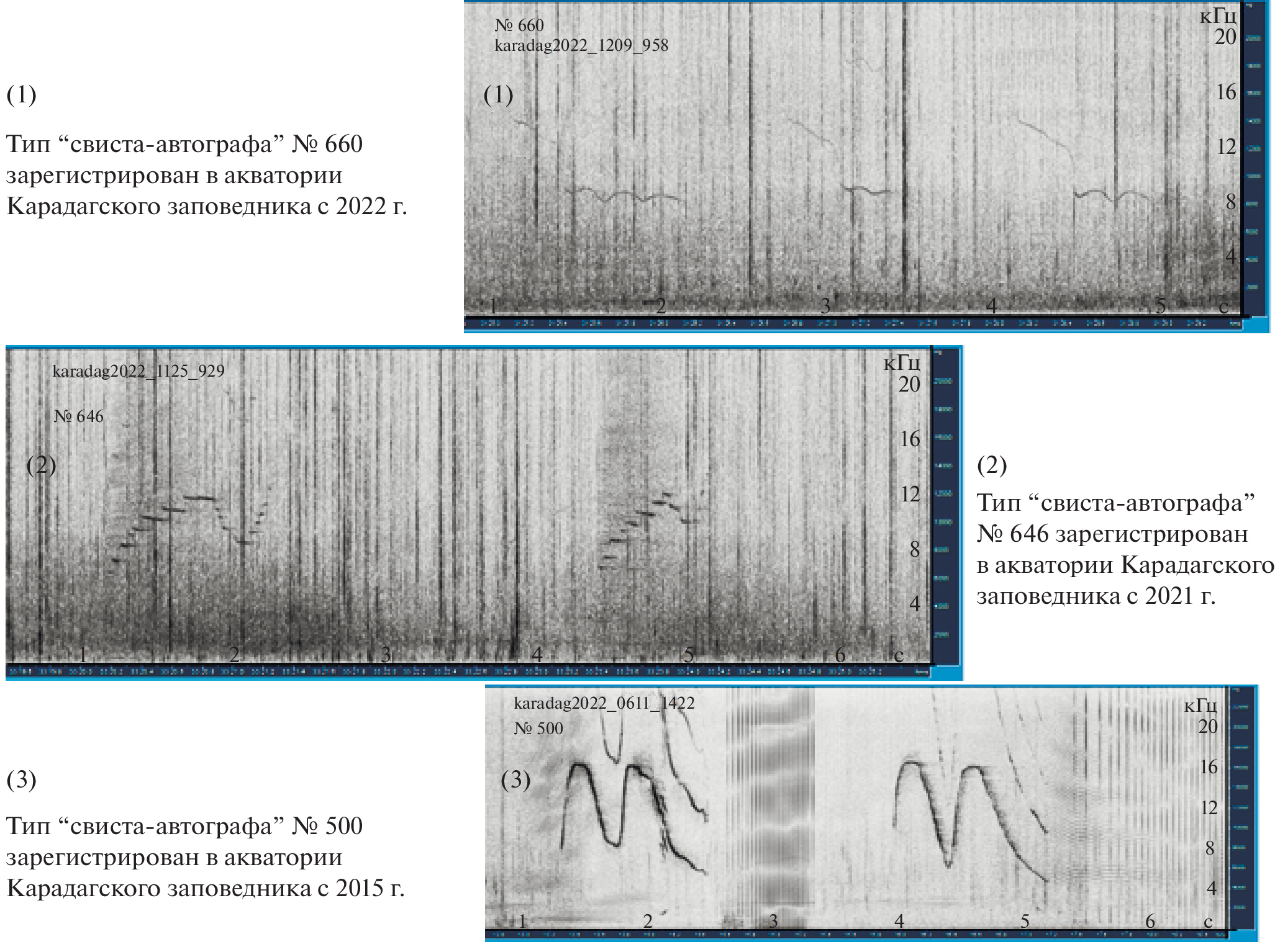The work is devoted to the study of the bottlenose dolphin community in the coastal waters of the Karadag Reserve (southeastern Crimea). Observations and acoustic recordings were carried out in 2015–2017 and in 2020–2022 As the main method for identifying bottlenose dolphins, we used the method developed by us for acoustic recording of bottlenose dolphins by individual sound signals “signature whistles”. This method of identification makes it possible to fairly accurately count the population, observe the movements of bottlenose dolphins, and also reveal the association of individuals with each other.