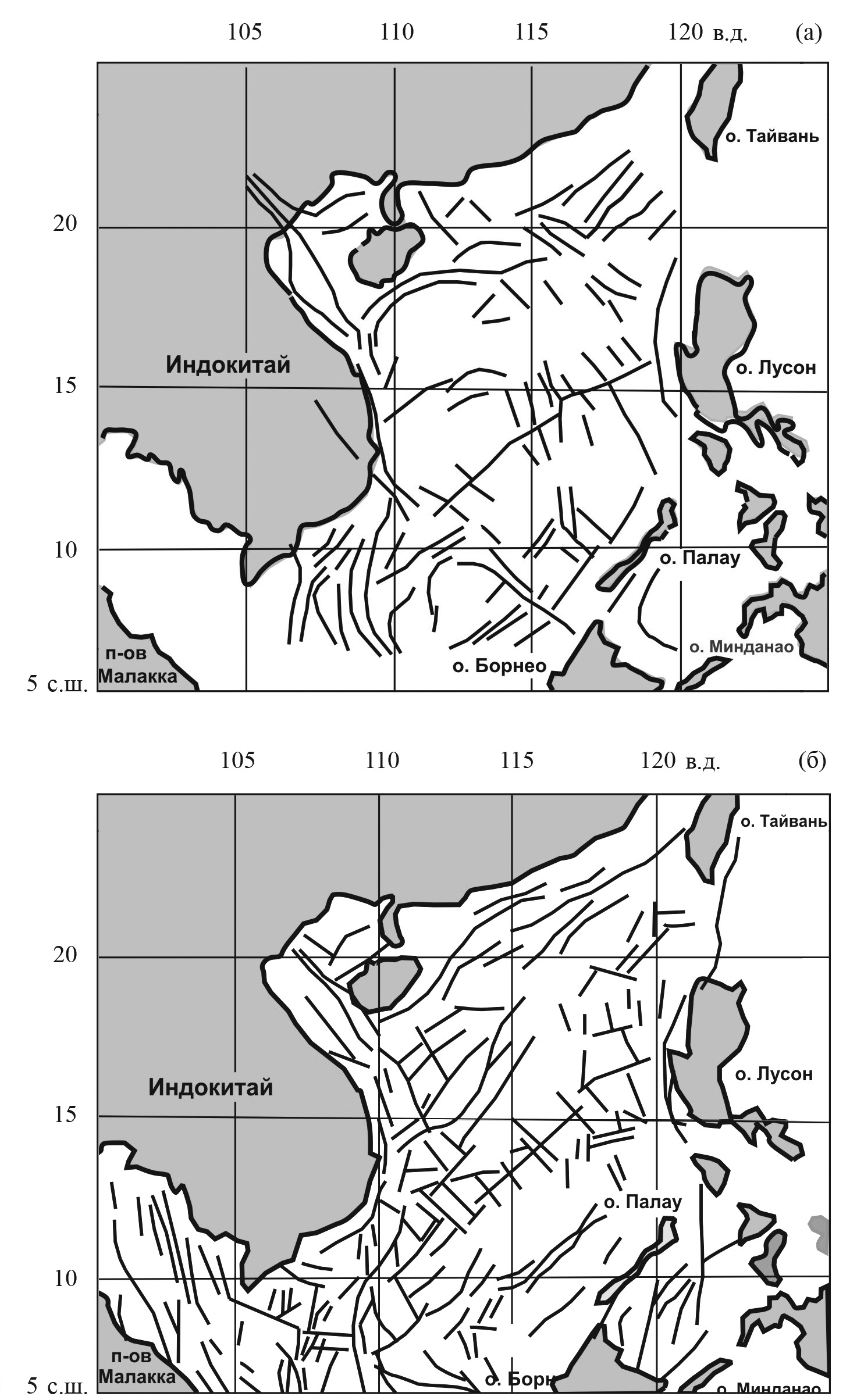 Южно-Китайское море располагается на стыке трех литосферных плит: Евроазиатской, Тихоокеанской и Индо-Австралийской (рис. 1а), что предопределяет сложность геодинамической истории и строения его тектоносферы. Структуры дна Южно-Китайского моря характеризуются северо-восточной, субмеридиональной и северо-западной ориентировками (рис. 1б; 2). Центральная часть моря представляет собой глубоководную котловину (глубина дна 3–4 км), вытянутую в СВ направлении. Мощность земной коры океанического типа здесь составляет всего 6–8 км [20, 29, 39], а гранитно-метаморфический слой практически отсутствует. В этом районе моря регистрируются линейные знакопеременные магнитные аномалии, связываемые c протоокеаническим спредингом, сопровождаемым астеносферным поднятием [29, 39]. Возраст магнитных аномалий определен по магнитостратиграфической шкале в интервале 24–32 млн лет [19, 21, 44].