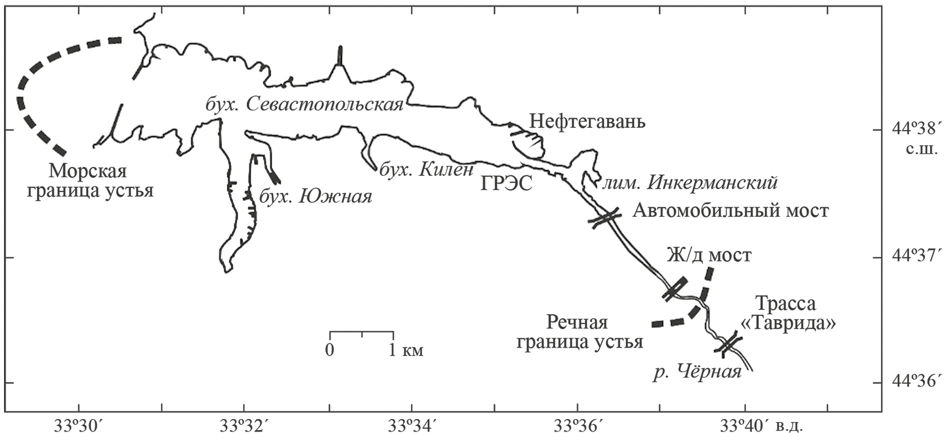 В 2017–2022 гг. в МГИ РАН проводились экспедиционные исследования в устьевой области р. Черной (г. Севастополь). Морское устье р. Черной включает устьевой участок реки и сложное устьевое взморье — Инкерманский лиман, Севастопольскую бухту и прилегающую часть Черного моря (рис. 1) [9].