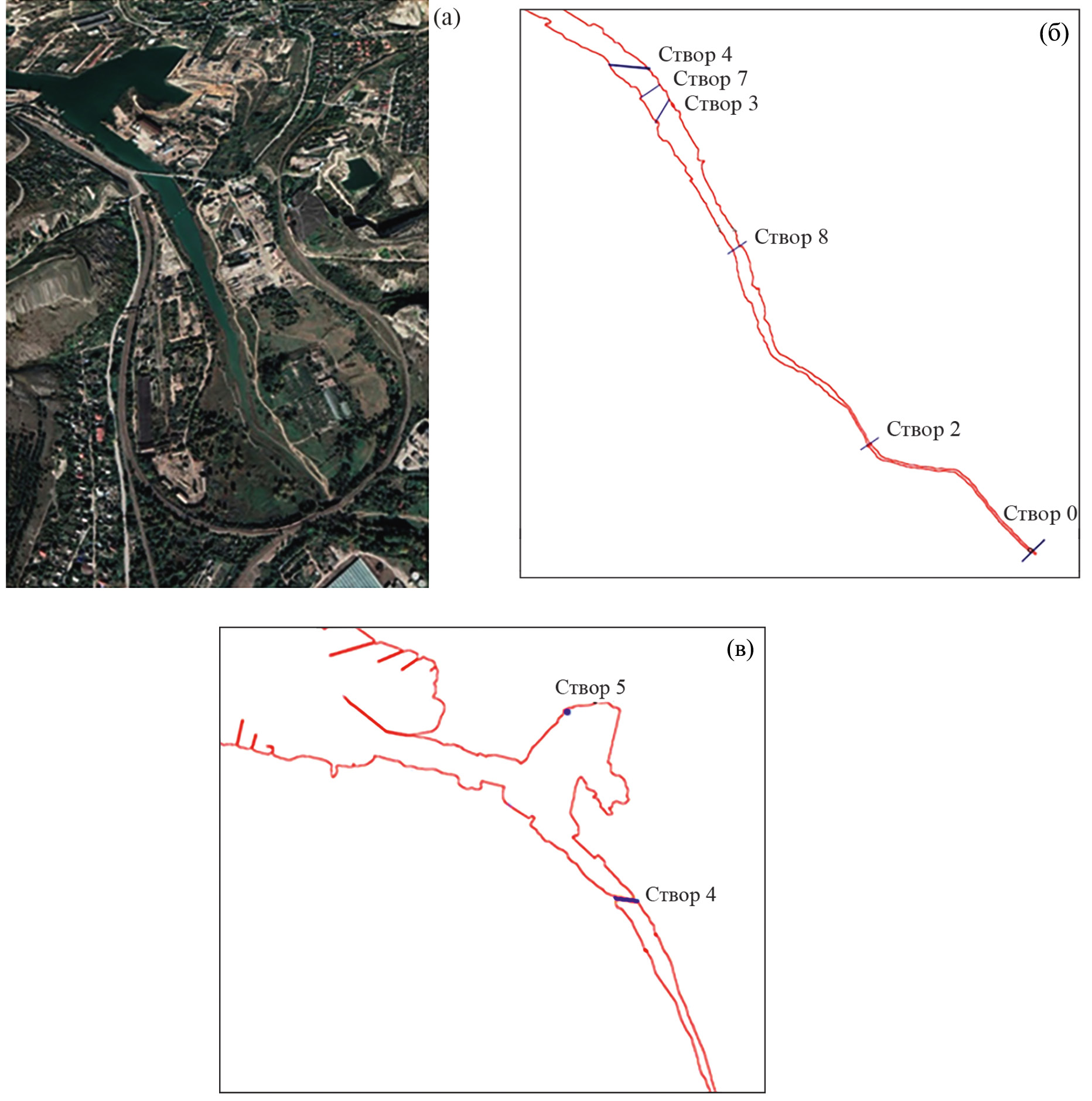 Рис. 2. Спутниковый снимок устья р. Черной (а), схемы створов в устье (б) и в Инкерманском лимане (в)