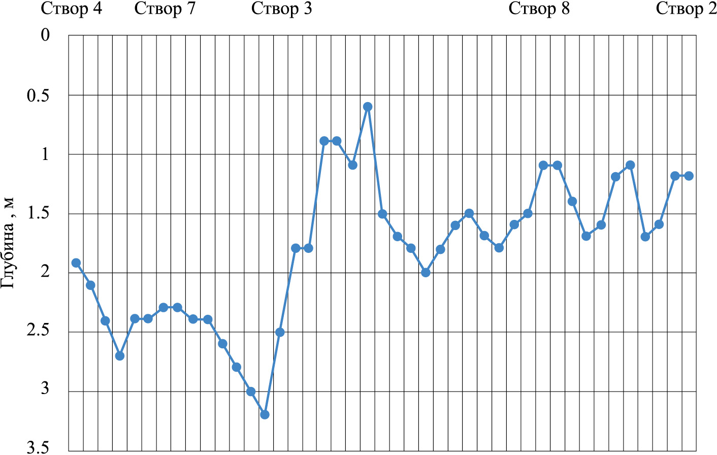 При выборе створов учитывались особенности местности, наличие гидротехнических сооружений (мостов, плотин, переходов), подъездные пути. Для определения профиля дна в створах выполнялись батиметрические съемки с использованием лотлиня и эхолота Garmin Echomap 42dv. Выполненные промерные работы позволили получить представление о рельефе дна устья. Для примера на рисунке 3 представлен продольный профиль участка устья реки от створа 4 до створа 2.