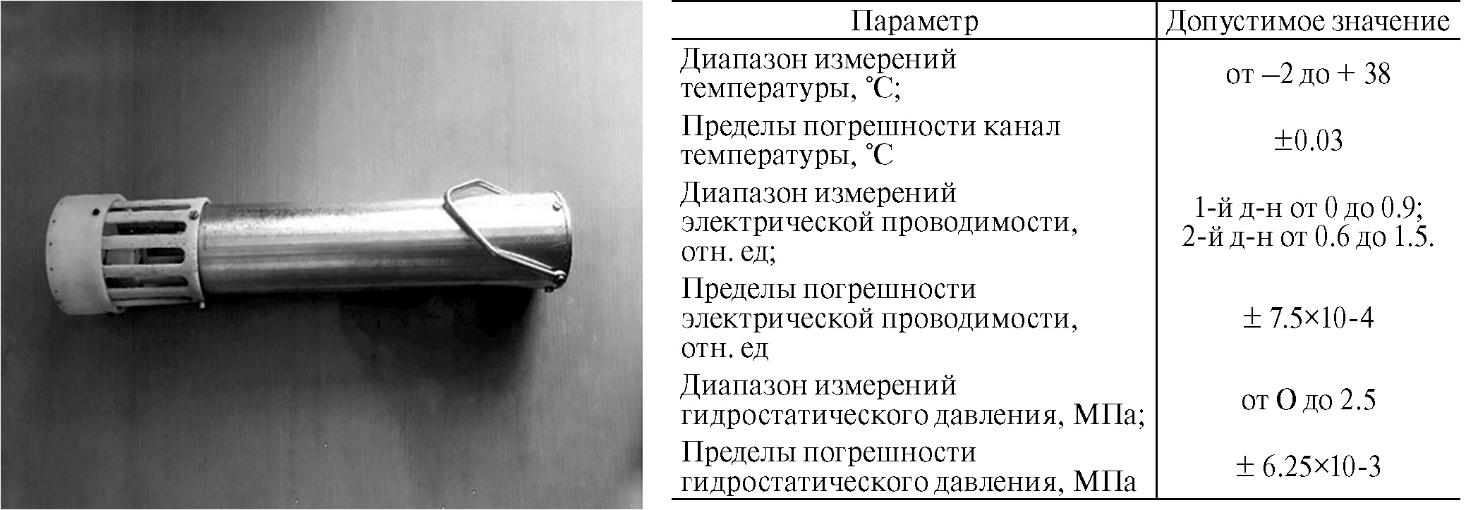 Так, для получения данных о солености и температуре применялись современные CTD-зонды [3]. В частности, использовался разработанный в МГИ РАН гидрозонд «ГАП-АК-12Р» [4, 16], основные характеристики и фотоизображение которого представлены на рис. 5.