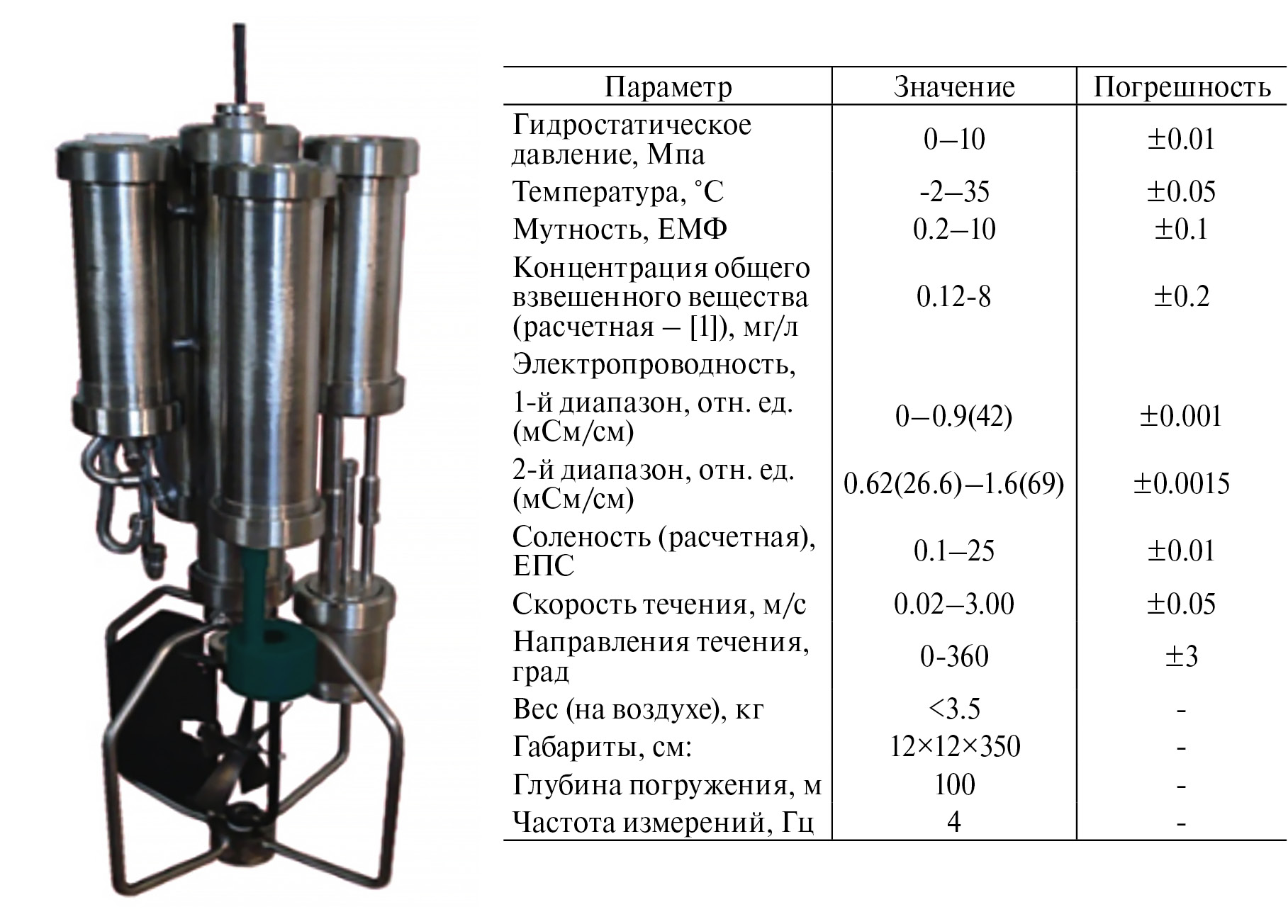 Для исследования процессов седиментации и транспорта наносов проводились измерения концентрации взвеси, мутности, скорости и направления течения. Для этих целей применялся зондирующий биофизический комплекс «Кондор» (НПП «Аквастандарт») [6]. Его изображение и технические характеристики показаны на рис. 7.