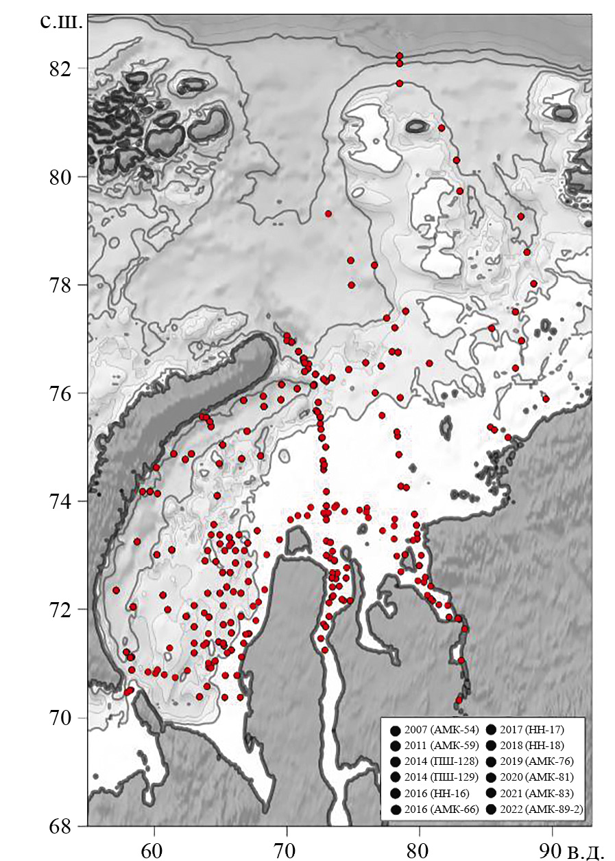 Данные о содержании взвешенного вещества (PM), содержании общего (TOC), растворенного (DOC) и взвешенного (POC) органического углерода были получены в ходе выполнения исследований по программе “Экосистемы морей Сибирской Арктики” в 2007–2022 гг. Работы проводились с бортов НИС “Академик Мстислав Келдыш” (АМК54 – 2007 г., АМК59 – 2011 г., АМК66 – 2016 г., АМК76 – 2019 г., АМК81 – 2020 г., АМК83 – 2021 г., АМК89-2 – 2022 г.), НИС “Профессор Штокман” (ПШ128, ПШ129 – 2014 г.) и ДЭ “Норильский Никель” (НН16 – 2016 г., НН17 – 2017 г., НН18 – 2018 г.). Места отбора проб представлены на карте (рис. 1).