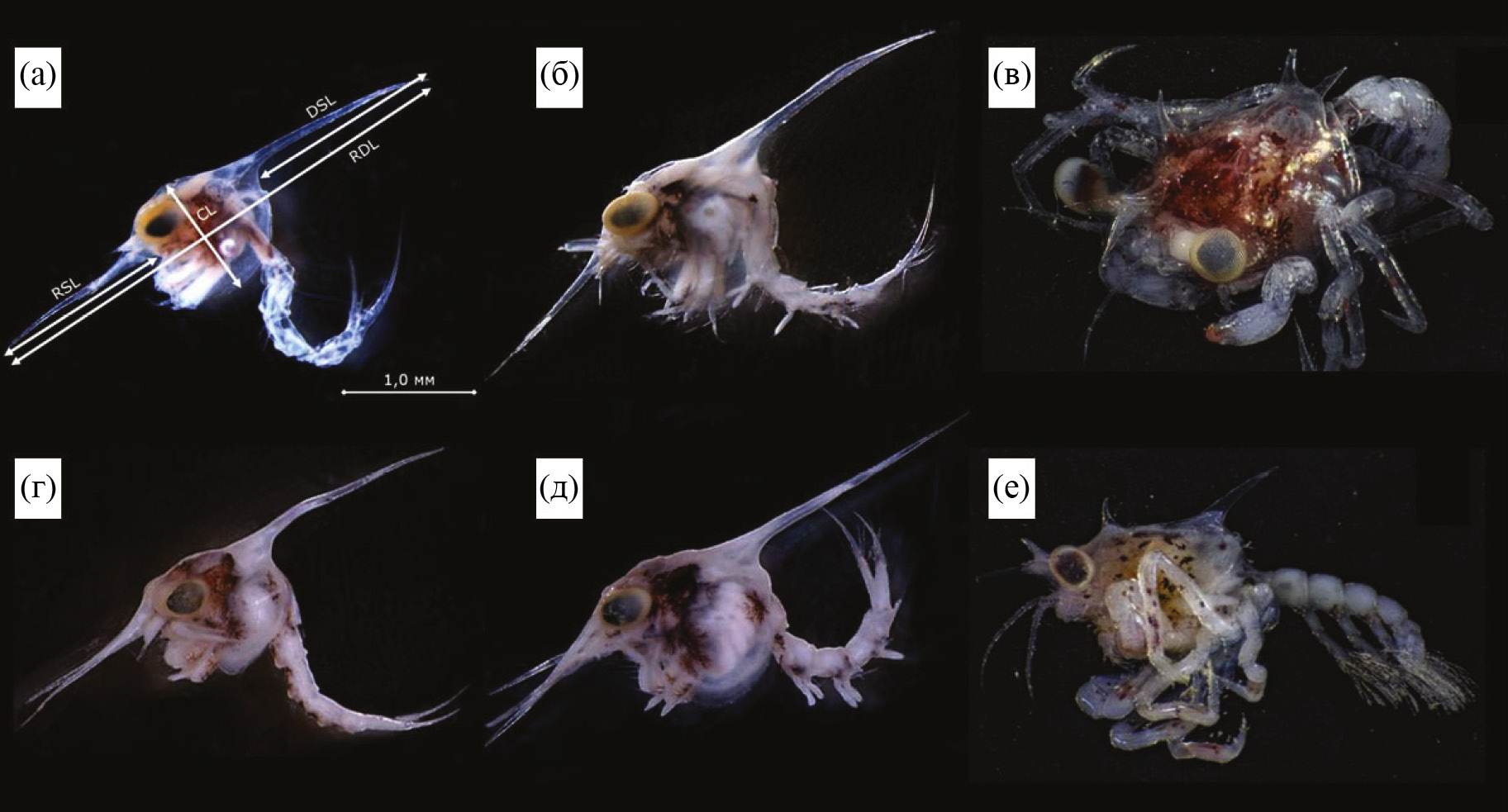 На станциях, наиболее удаленных друг от друга: 6222, 6224, 6236, 6257 и 6281, личинки были отобраны для молекулярно-генетических и морфологических исследований, со станции 6282 только для морфометрии (рис. 2, табл. 1). Промеры включали в себя следующие параметры: DSL — длина спинного шипа, RSL — длина рострального шипа, и CL — длина панциря (рис. 1а) [19].