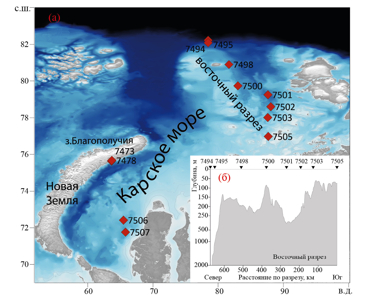 Рис. 1. Карта станций, выполненных в ходе 89 рейса НИС “Академик Мстислав Келдыш”. (а) – расположение станций, (б) – профиль восточного разреза