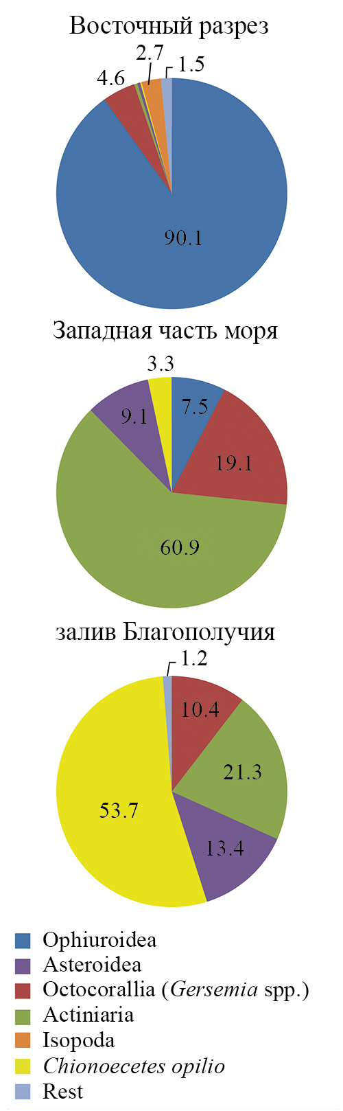 Ландшафты станций западной части моря и залива Благополучия существенно менее разнообразны, отличаются мягкими субстратами, а также меньшей численностью и разнообразием организмов. На станциях западной части моря численность мегафауны составляла около 20 экз/10 м2, на станциях залива Благополучия 1.9 и 5.7 экз/10 м2. Разнообразие также существенно ниже. Если на шельфовых станциях восточного разреза мы наблюдали 6–12 таксонов на станцию, то в западной части моря и заливе Благополучия эти значения составляли 3–7 таксонов. Доминирующие таксоны также существенно отличаются — в западной части моря по численности доминируют актинии, мягкие кораллы Gersemia sp. и мелкие морские звезды семейства Asteriidae, в заливе Благополучия доминирует краб-стригун Chionoecetes opilio, доля которого по численности составляет 36 и 72% на станциях внутренней котловины и внешнего порога соответственно, субдоминантами являются также актинии, мягкие кораллы Gersemia sp. и звезды семейства Asteriidae, из которых можно отметить крупных особей Urasterias lincki и Icasterias panopla (рис. 3).