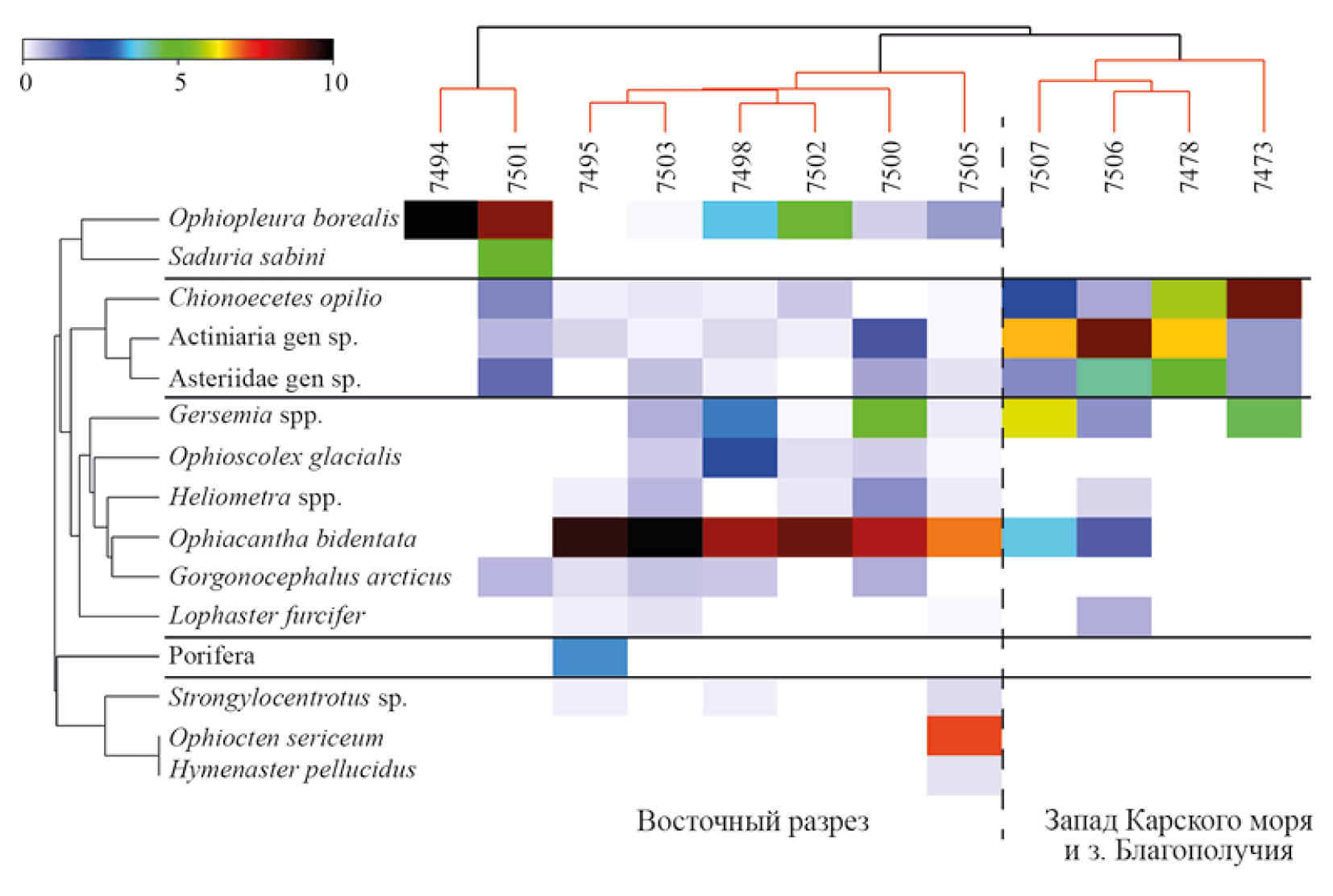 На более глубоких участках с интенсивной седиментацией руководящим видом становится офиура Ophiopleura borealis. Сообщество с ее доминированием было описано в этом районе ранее [3, 6]. При переходе к мелководным участкам шельфа оно сменяется на сообщество Ophiocten sericeum (ст. 7505). Данное сообщество было впервые выделено З.А. Филатовой и Л.А. Зенкевичем [30], которые описали его как преимущественное для всей восточной части моря и оценили его как наиболее богатое видами сообщество Карского моря. Оно отличается высоким видовым разнообразием и имеет многочисленные региональные разновидности. В состав массовых форм мегафауны входят офиура Ophiacantha bidentata и морские звезды Ctenodiscus crispatus, Hymenaster pellucidus, Icasterias panopla и Pontaster tenuispinus.