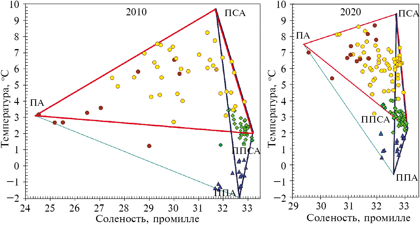 Рис. 3. TS-диаграммы рассеивания средних по слоям значений температуры и солёности на станциях океанологических съёмок в юго-западной части Чукотского моря летом 2010 и 2020 гг. Показатели поверхностных водных масс обозначены жёлтым и коричневым цветами, подповерхностных водных масс – зелёным и синим цветами. В углах области рассеивания обозначены TS-индексы водных масс автохтонных для Чукотского моря (ПА – поверхностная арктическая, ППА – подповерхностная арктическая) и водных масс тихоокеанского происхождения (ПСА – поверхностная субарктическая, ППСА – подповерхностная субарктическая). Треугольники смешения ПСА с ПА и ППСА обозначены красным цветом, треугольники смешения ППСА с ППА и ПСА обозначены синим цветом.